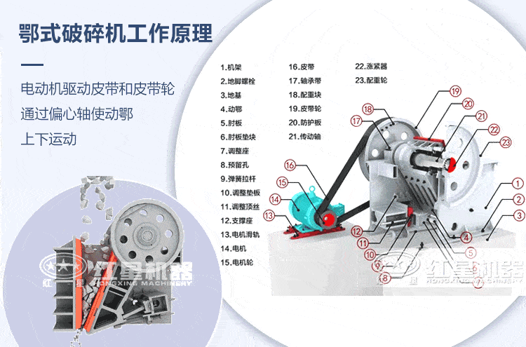 電動(dòng)機(jī)驅(qū)動(dòng)皮帶和皮帶輪,通過(guò)偏心軸使動(dòng)鄂上下運(yùn)動(dòng),當(dāng)動(dòng)鄂上升時(shí)肘板與動(dòng)鄂間夾角變大,從而推動(dòng)動(dòng)鄂板向固定鄂板接近,與其同時(shí)物料被壓碎或劈碎,達(dá)到破碎的目的;當(dāng)動(dòng)鄂下行時(shí),肘板與動(dòng)鄂夾角變小,動(dòng)鄂板在拉桿彈簧的作用下,離開固定鄂板,此時(shí)已破碎物料從破碎腔下口排出。隨著電動(dòng)機(jī)連續(xù)轉(zhuǎn)動(dòng)而破碎機(jī)動(dòng)鄂作周期運(yùn)動(dòng)壓碎和排泄物料,實(shí)現(xiàn)鄂式破碎機(jī)的批量生產(chǎn)。